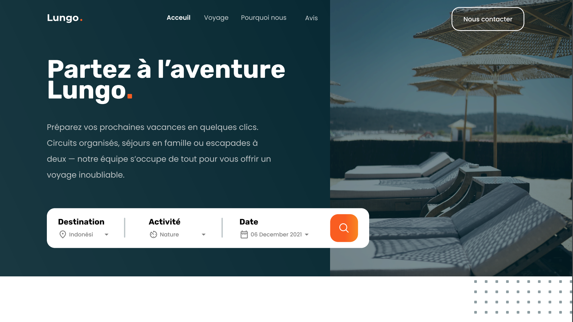 Refonte complète de la landing page de Lungo, une agence de voyage spécialisée dans les séjours personnalisés et les circuits thématiques.